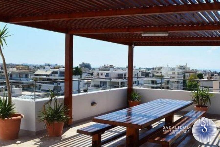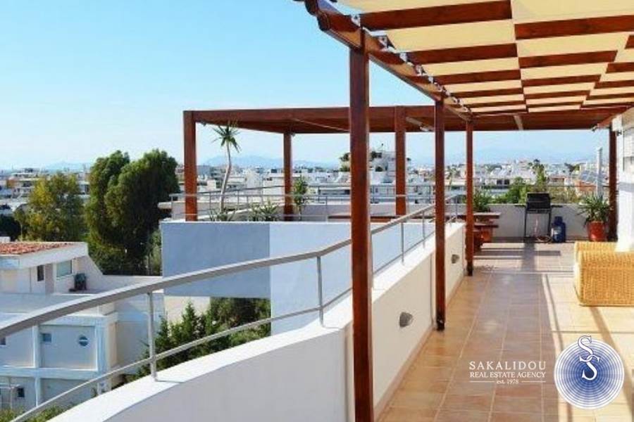 ΓΛΥΦΑΔΑ ΚΕΝΤΡΟ, εξαιρετικό ρετιρέ επιπλωμένο διαμέρισμα 5ου ορόφου, 90 τ.μ., μεγάλες βεράντες με θέα βουνό - θάλασσα, πολύ φωτεινό και διαμπερές, με 2 υπνοδωμάτια, 2 μπάνια, σαλόνι με ανοιχτή κουζίνα, αυτόνομη θέρμανση (φυσικό αέριο), κλιματισμός, ηλεκτρικά ρολά, σίτες, πόρτα ασφαλείας, ασανσέρ, σε πολύ καλή κατάσταση, πλήρως επιπλωμένο και εξοπλισμένο, κέντρο-απόκεντρο, δίπλα στην πλατεία με τα πόδια.