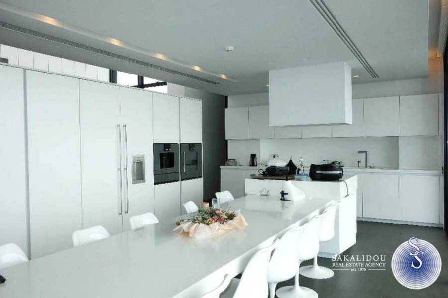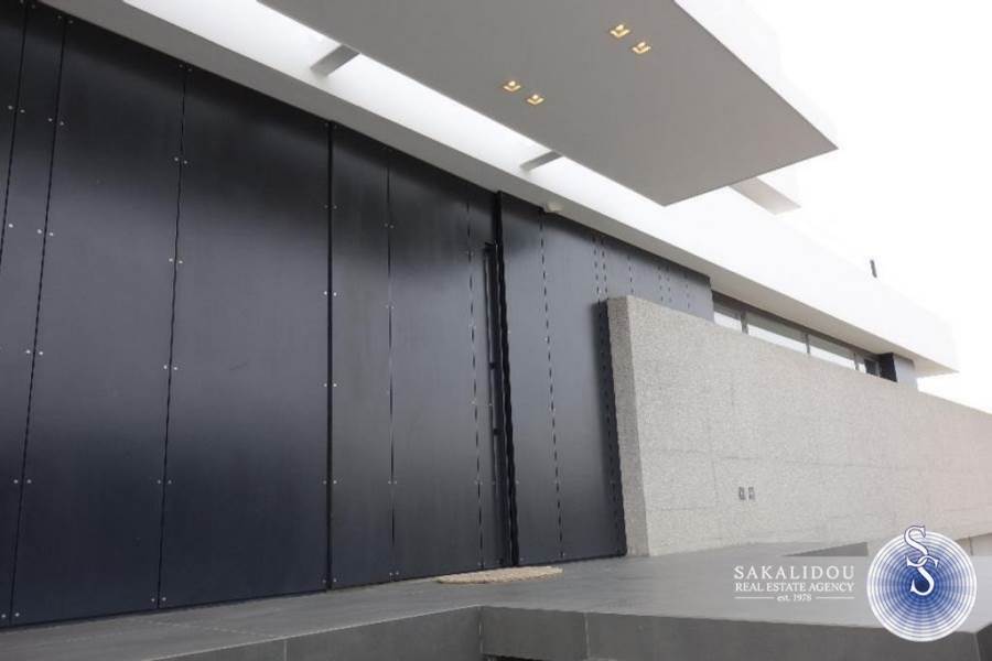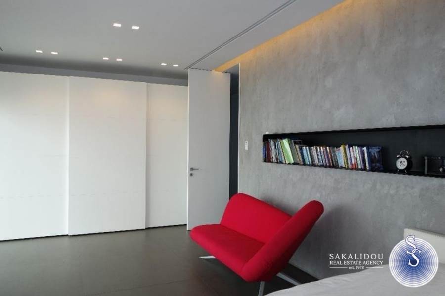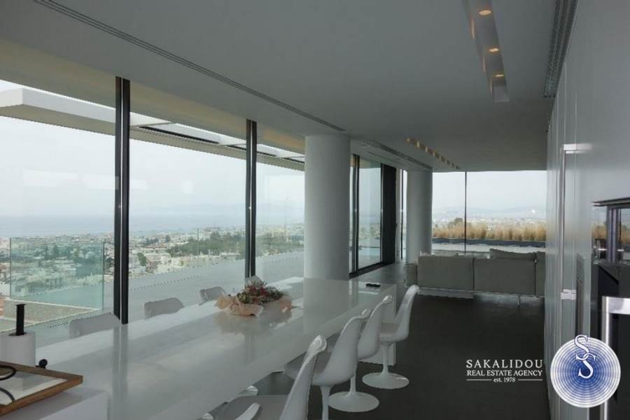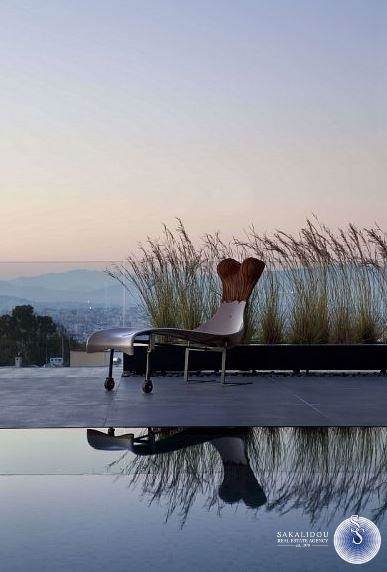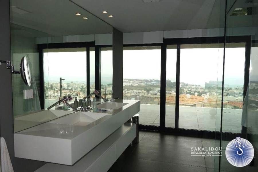ALIMOS Pani, luxurious minimal architectural house of 3 levels 650 sq.m, in a unique spot with unlimited panoramic unobstructed sea view, construction 2015, modern high standards, smart home, independent heating with geothermal, 5 bedrooms, one is master en - suite with walk in closet and Jacuzzi, 3 bathrooms, wc, 3 living rooms, 2 kitchens, 3 fireplaces, elevator, laundry, guest house, storage areas, large reception area, high ceiling, bright comfortable spaces, permeable, hidden lighting, false ceilings, heated swimming pool, garage.