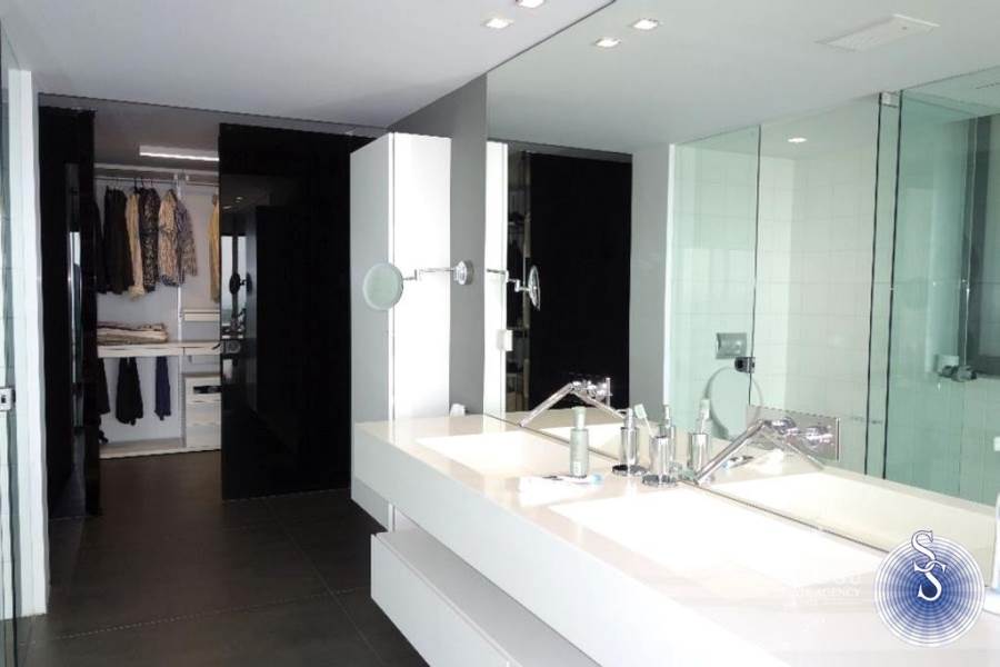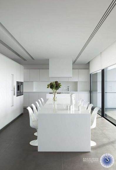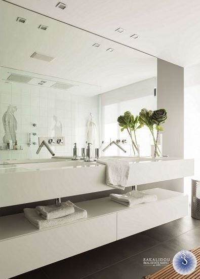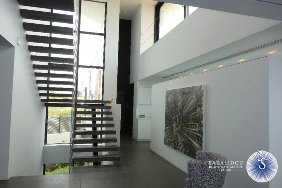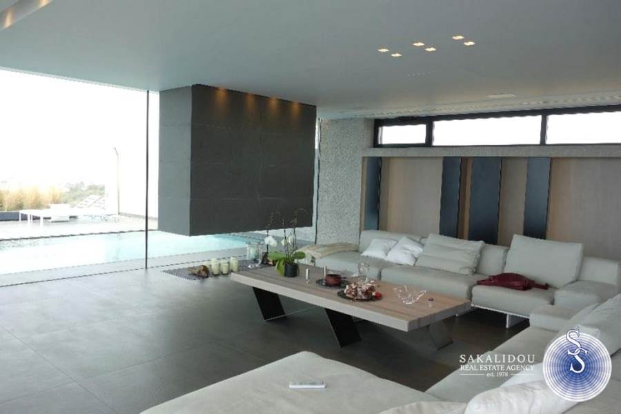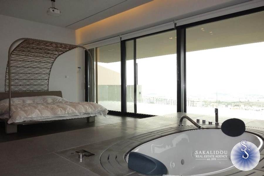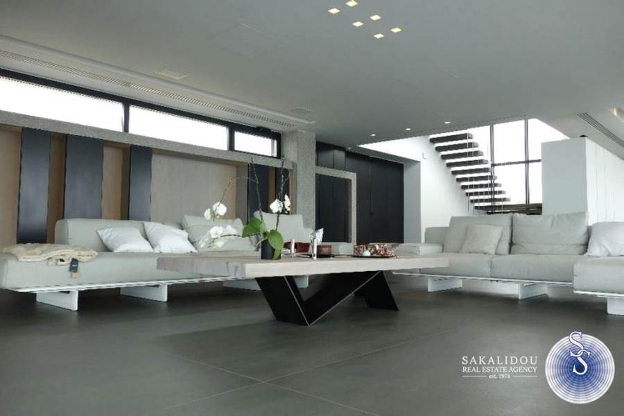 ALIMOS Pani, luxurious minimal architectural house of 3 levels 650 sq.m, in a unique spot with unlimited panoramic unobstructed sea view, construction 2015, modern high standards, smart home, independent heating with geothermal, 5 bedrooms, one is master en - suite with walk in closet and Jacuzzi, 3 bathrooms, wc, 3 living rooms, 2 kitchens, 3 fireplaces, elevator, laundry, guest house, storage areas, large reception area, high ceiling, bright comfortable spaces, permeable, hidden lighting, false ceilings, heated swimming pool, garage.