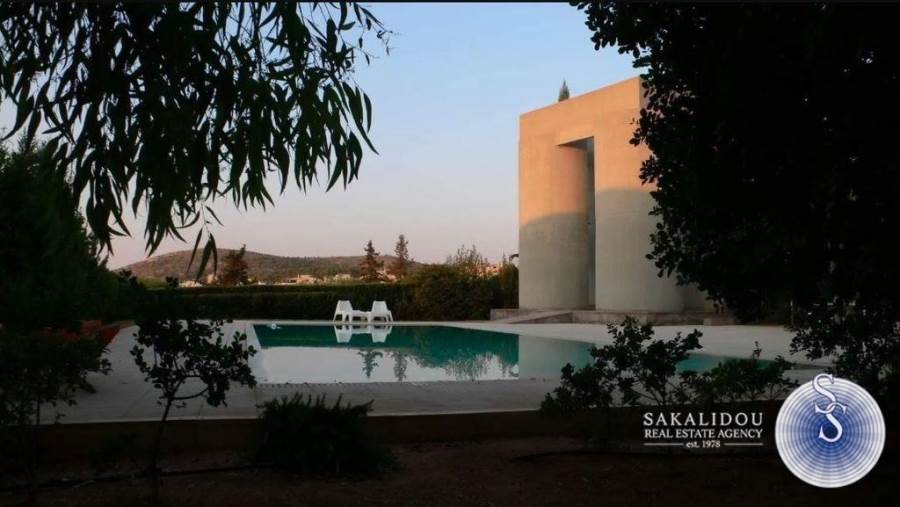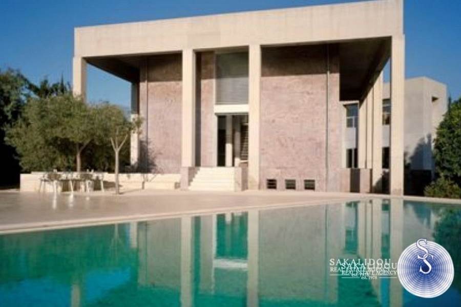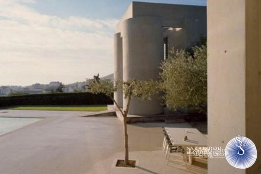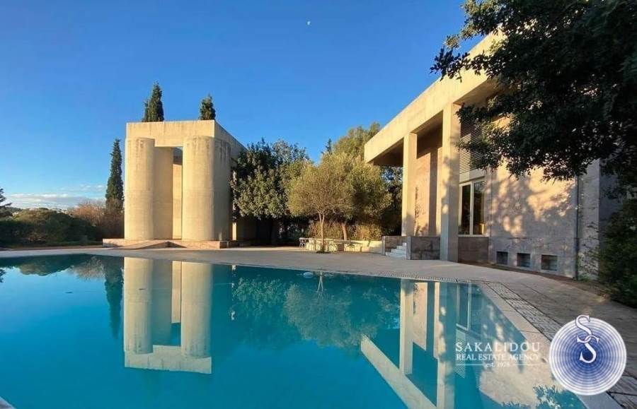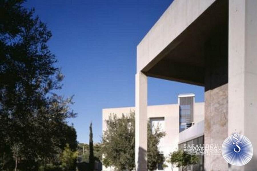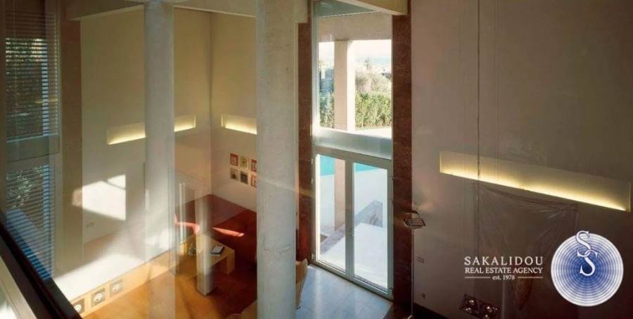 Varkiza, unique super lux villa of 3 levels 700 sq.m., on a plot of 3200 sq.m., year of construction: 2000, unique architecture and aesthetics, with beautiful sea view. It consists of 3 volumes which communicate externally, reception area with glass patio, high ceiling living room, unique garden with pool 80 sq.m with overflow, independent guest house of 100 sq.m., staff apartment, underfloor heating, wooden floors, security door and closed garage.
