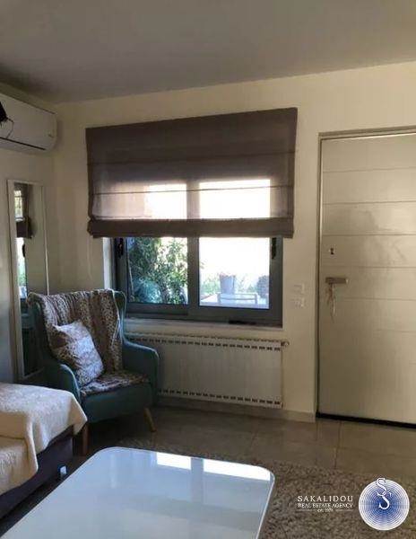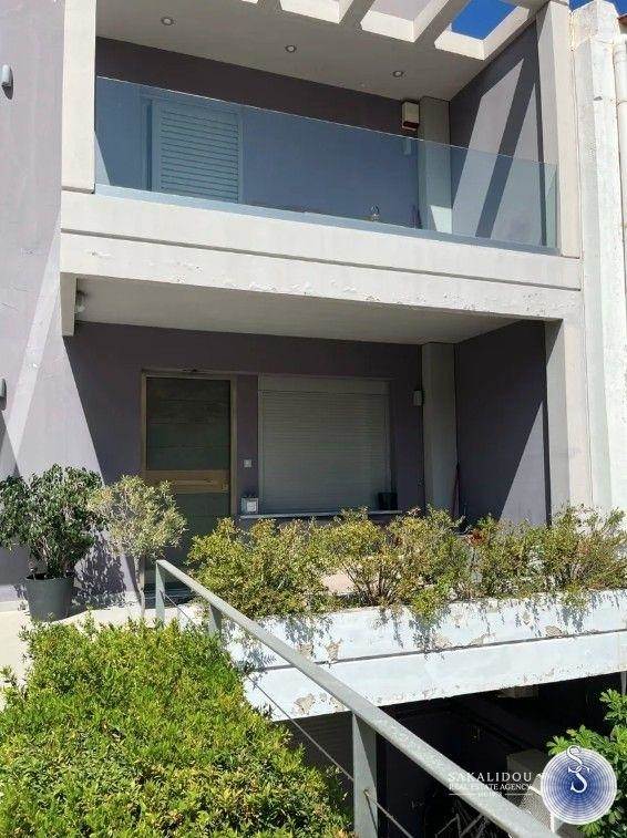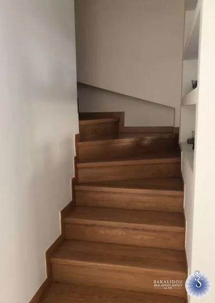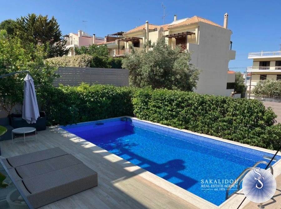 Glyfada, Aigli, Newly Built and Modern Maisonette For Rent of 103 sq.m., ground floor - 1st floor, on 2 levels, year of construction 2018, luxury construction, on a plot of 395 sq.m., with good view, mountain view, garden, outdoor common use swimming pool, 2 bedrooms, 1 bathroom, 1 wc, living room, terraces, internal staircase, fireplace, security door, video intercom, basement storage, double glazing, screens, airy, bright, solar, individual heating with heat pump, air conditioning, in a complex of two houses, excellent location, very quiet area with villas.