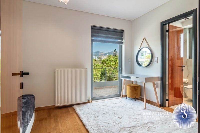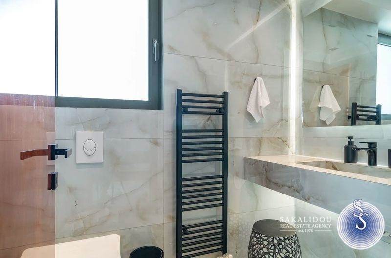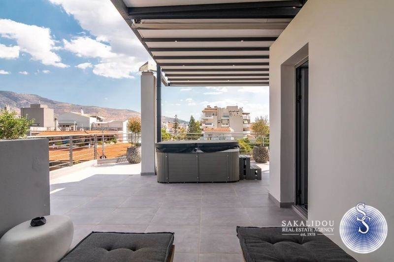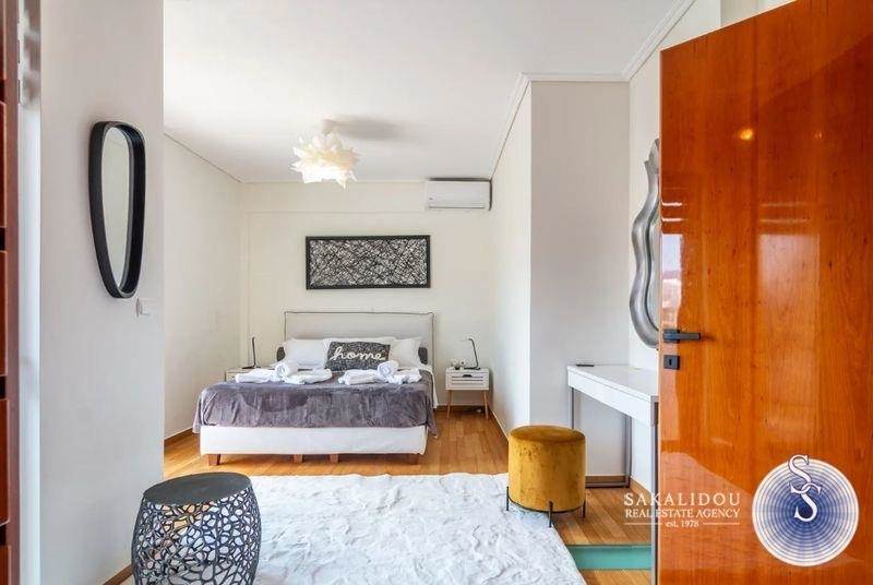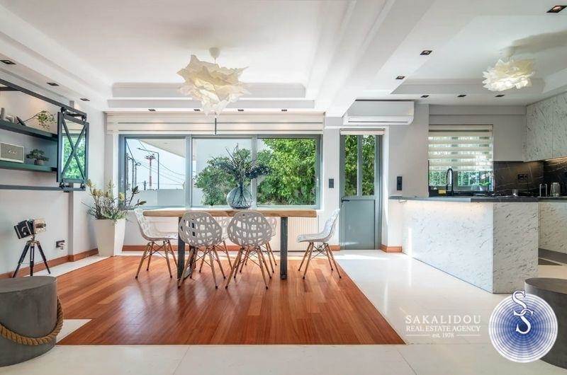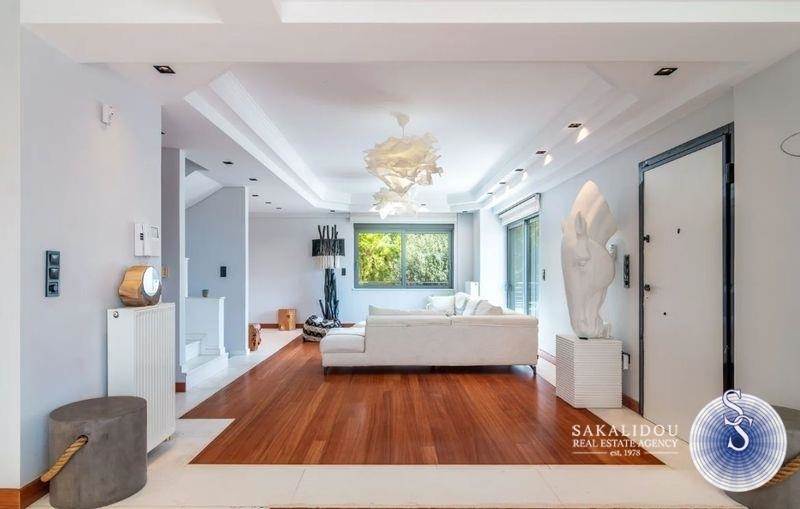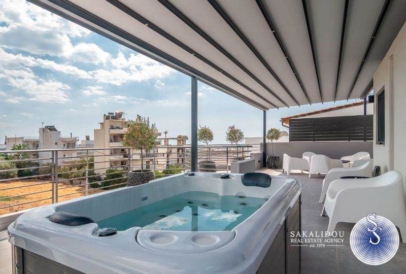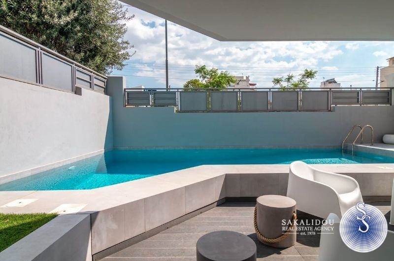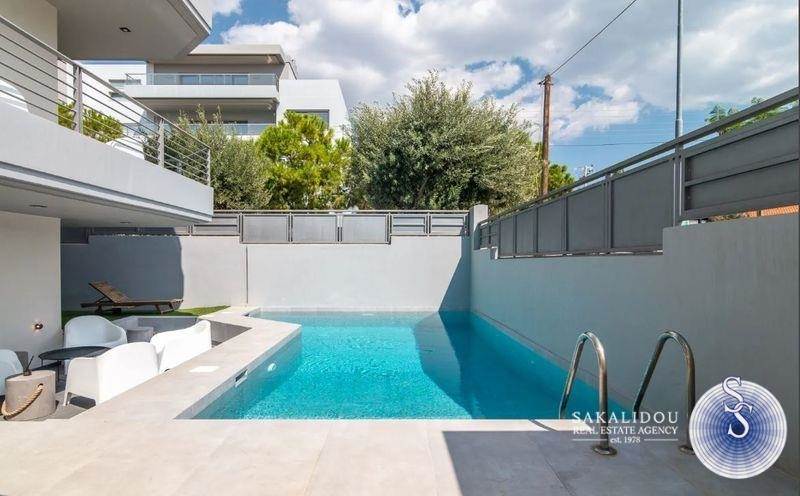 Glyfada, Evryali area, modern, fully renovated detached family house 270 sq.m., luxury, with a 40 sq.m. swimming pool, garden, outdoor jacuzzi, biometric pergola, renovated in 2024, 3 levels fully furnished with new furniture. In detail, it has 2 living room areas, 2 kitchen rooms fully equipped with built-in branded electrical appliances, 3 bathrooms, 2 WCs, outdoor Jacuzzi, elevator, air conditioning, solar, autonomous heating (Oil), screens, verandas, alarm, security doors, 2 closed parking spaces, storage room, playroom, attic and unobstructed sea views from almost all levels. Available furnished or unfurnished.