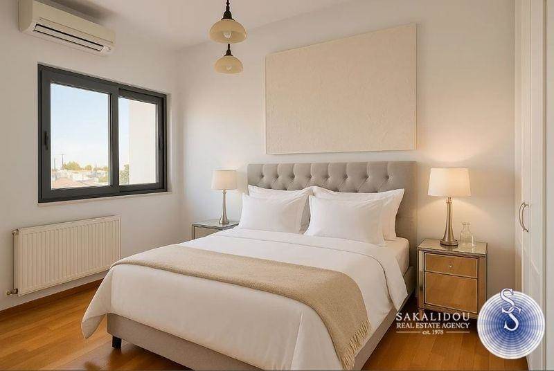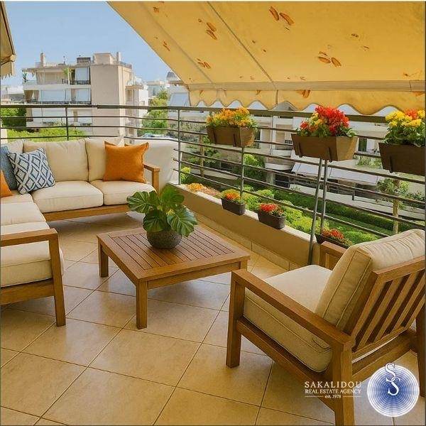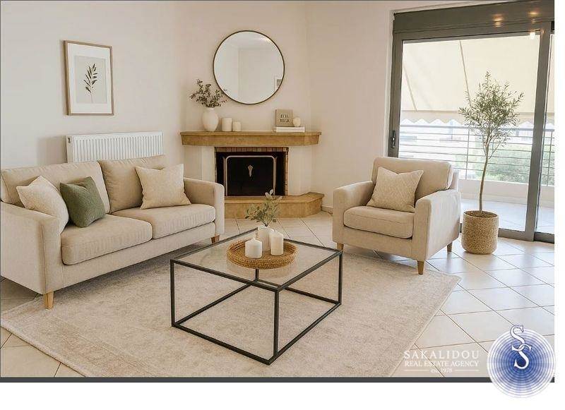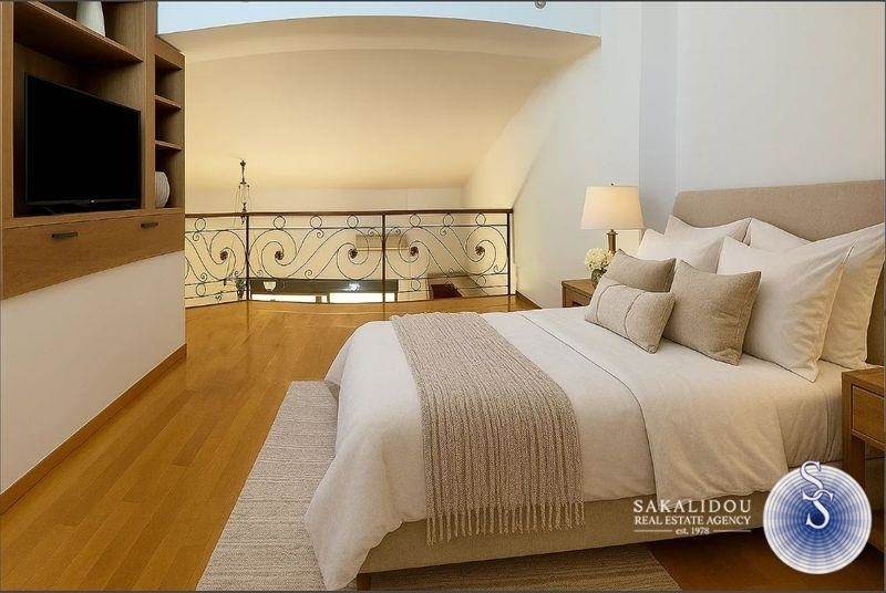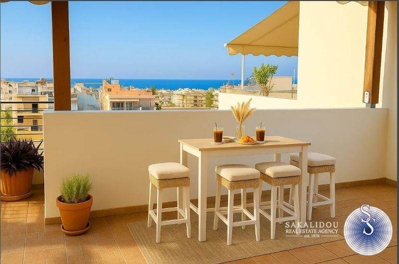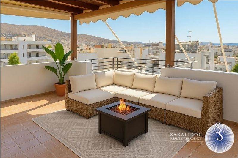 Bright duplex penthouse for sale in Glyfada, occupying the 3rd and 4th floors, featuring three bedrooms, one bathroom, a living room with fireplace, kitchen, underground parking, storage room, security door, alarm system, autonomous heating, and a triple-energy solar water heater. The property offers sea views and is located just ten minutes from Glyfada beach, five minutes from the Elliniko metro station, and ten minutes from the Ellinikon Park.