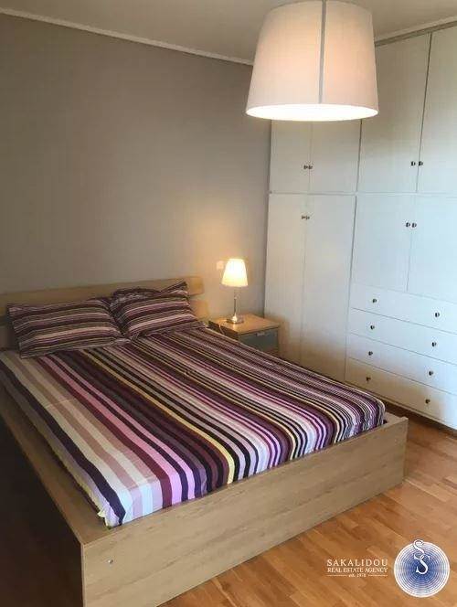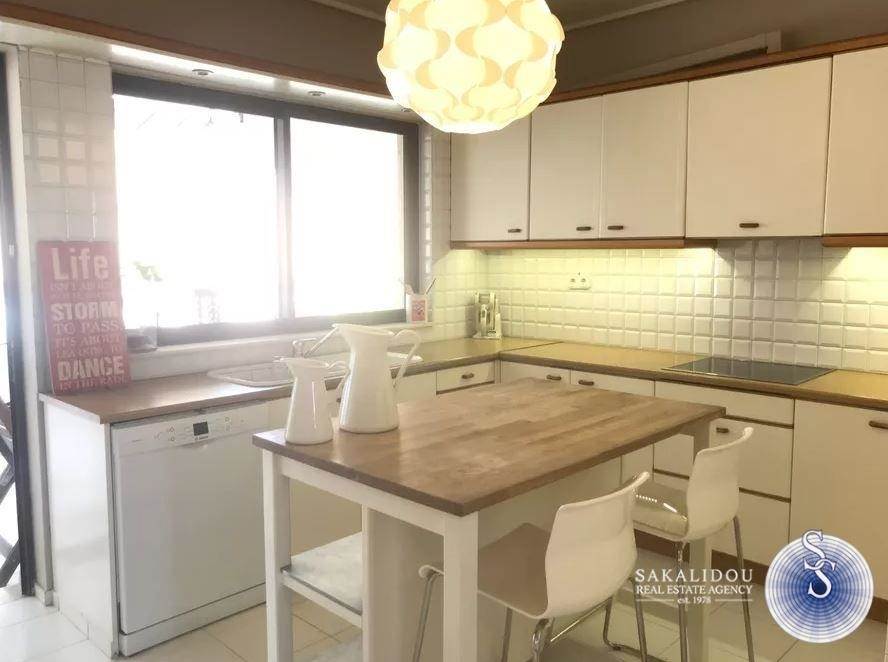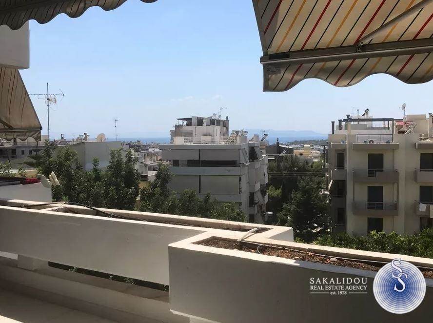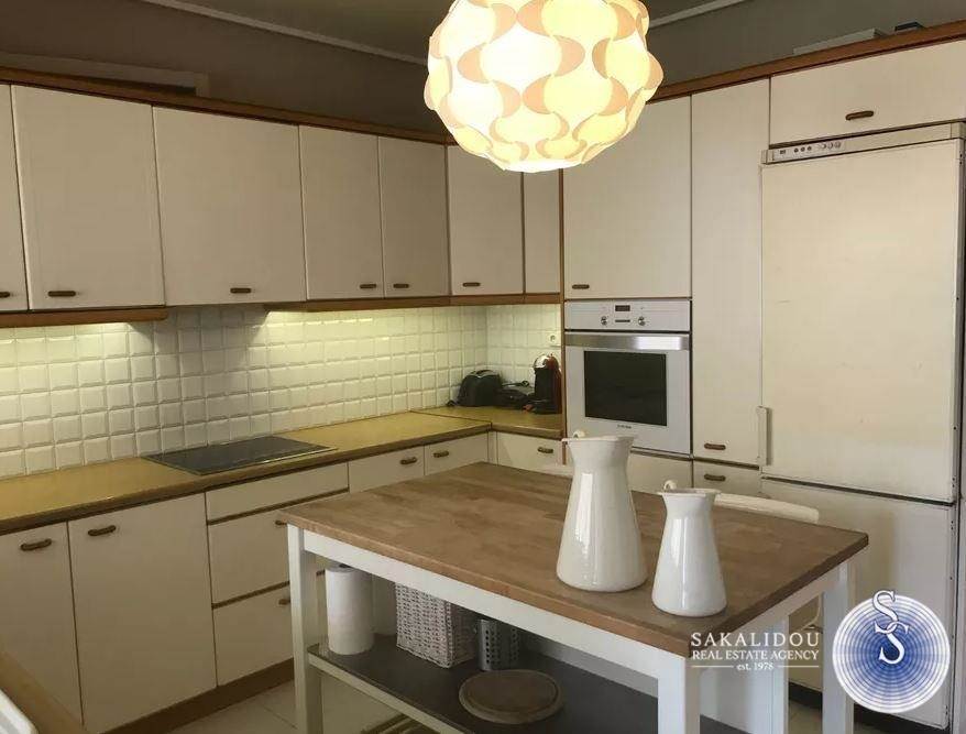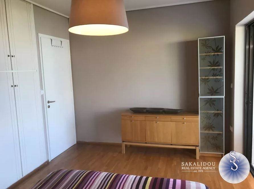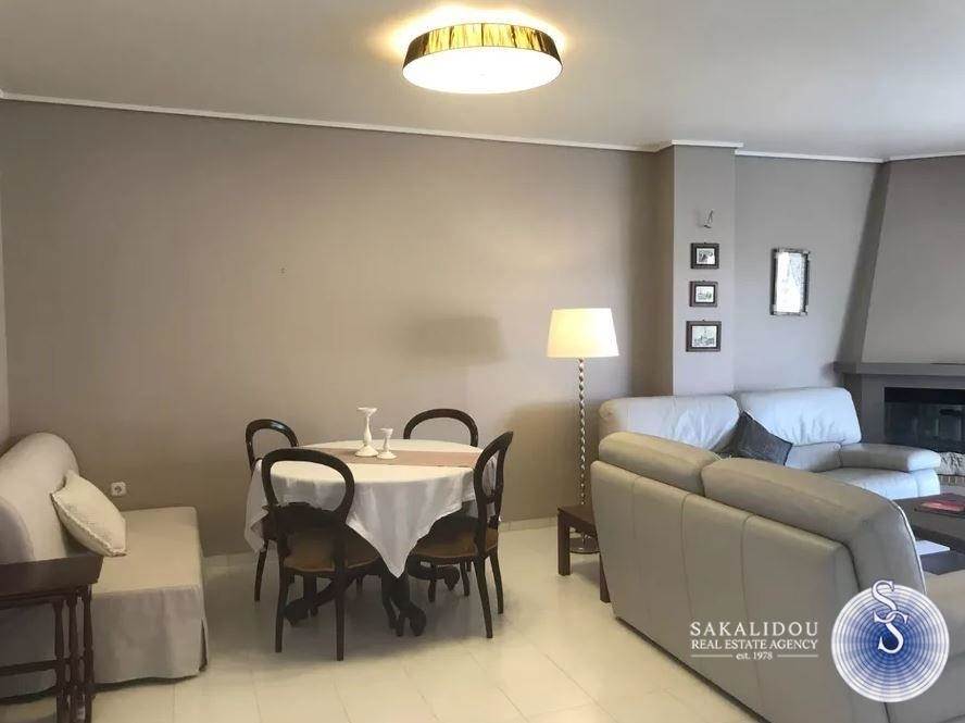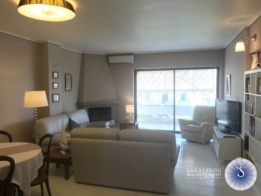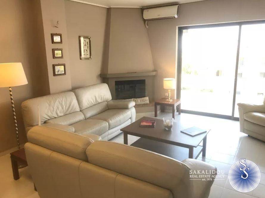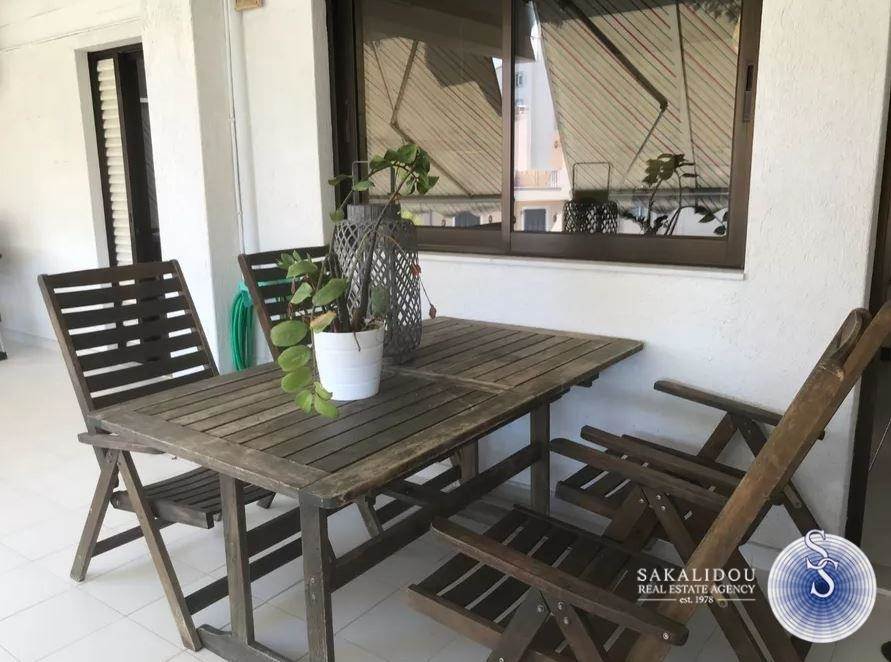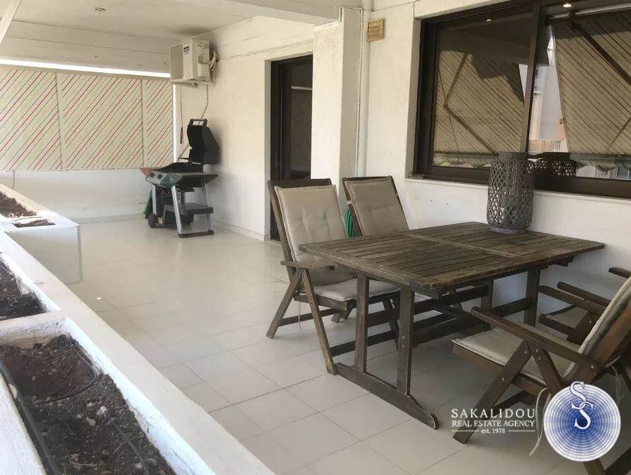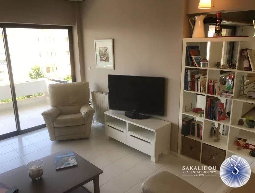 Glyfada, Exoni, furnished 2nd floor apartment 101 sq.m., frontage and bright, with a comfortable reception area with fireplace, fully equipped kitchen, 2 bedrooms, 1 bathroom, 1 wc, terrace, solar, autonomous heating, a/c, elevator, safety door, alarm, small parking place.
