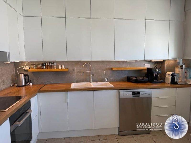 Glyfada Kato, fantastic furnished 4th floor apartment, great penthouse property of 130 sq m, with view - horizon, sea view, walking distance to the main square, unique aesthetic apartment with very expensive materials, recently renovated, built in 2005, has a comfortable and very bright living room area with fireplace, modern kitchen equipped with built-in electrical appliances, oak floors, perimeter verandas, 3 bedrooms, 1 Master, a total of 2 bathrooms, autonomous heating - oil, solar, a/c, awnings, built-in wardrobes, security door, elevator, 1 parking space - Pilot Parking, Internet, with a beautiful garden, nice environment, very privileged location, close to a neighboring market, schools and public transport on foot. Also, available unfurnished at the same price.