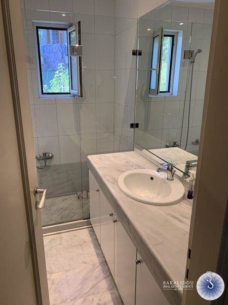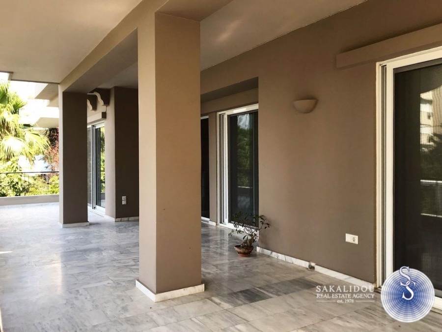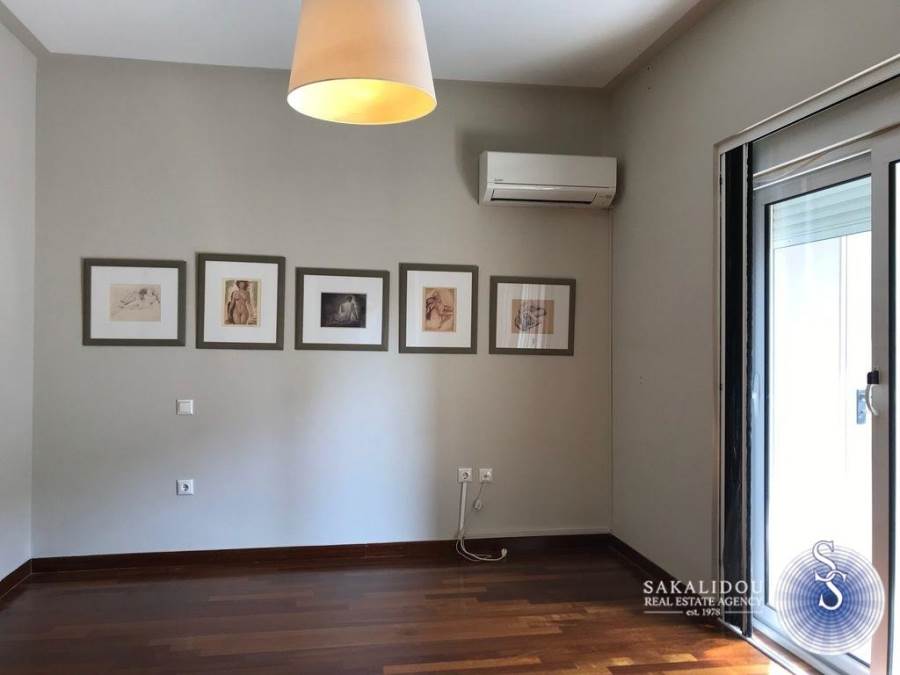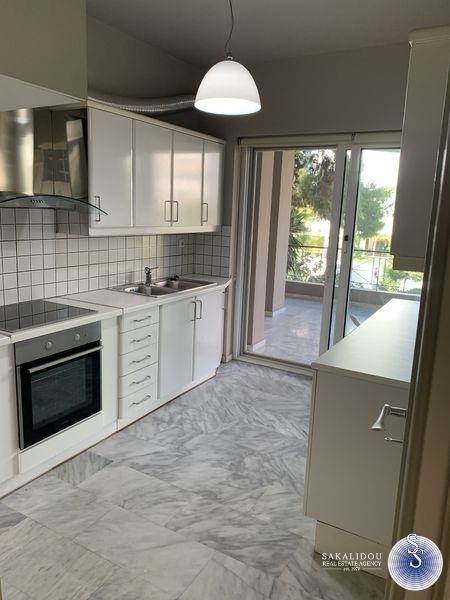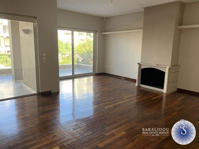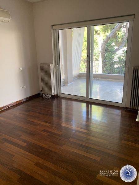 GLYFADA CENTER, 110 sq.m. 1st floor apartment, comfortable and very bright living room/sitting room with fireplace and spacious balconies facing the greenery, oak flooring everywhere, independent and very bright kitchen, 2 bedrooms, 1 master, bathroom, wc, autonomous heating system, a/c, alarm system, 1 parking place, walking distance to the Central Square.