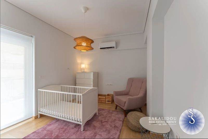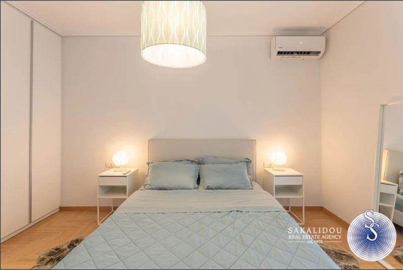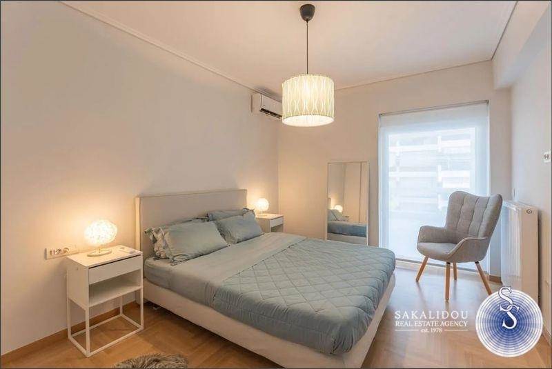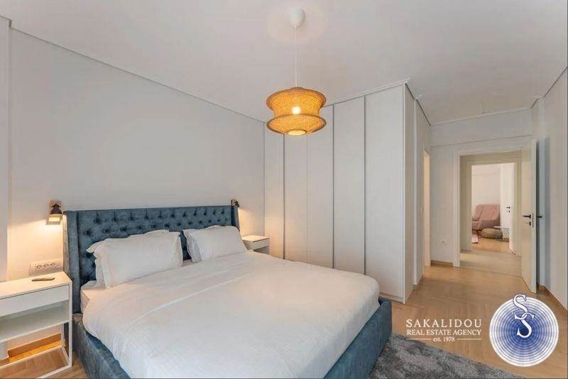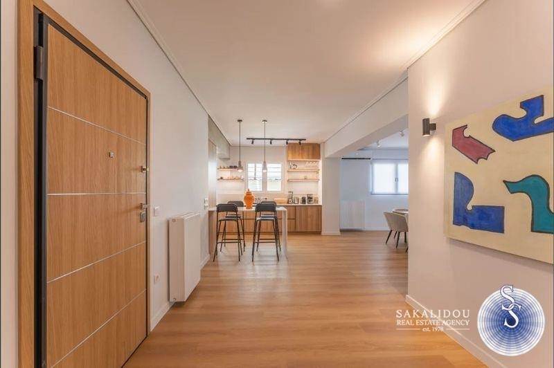 A luxurious, fully renovated, furnished, and equipped 152 sq.m. apartment is available for rent in Glyfada, located on the 2nd floor of a five-storey building in a prime area near the golf course. It features a spacious living area with direct access to a private balcony, an open-plan fully equipped kitchen, three bedrooms, two bathrooms, a separate office space, and a laundry room. Additional amenities include wooden floors, a fireplace, full air-conditioning, autonomous oil heating, a private parking space, and a storage room.