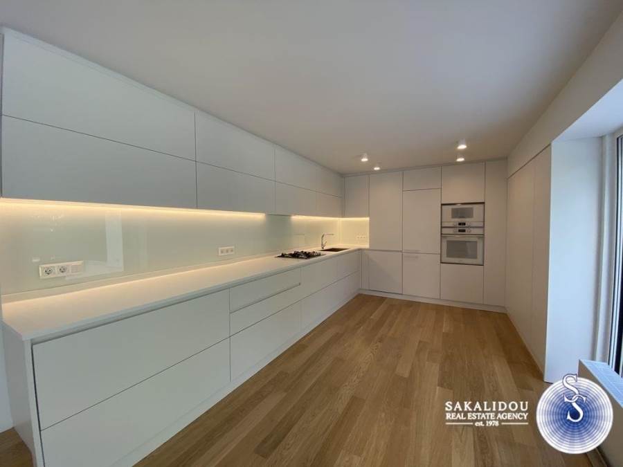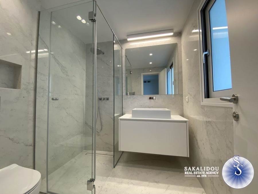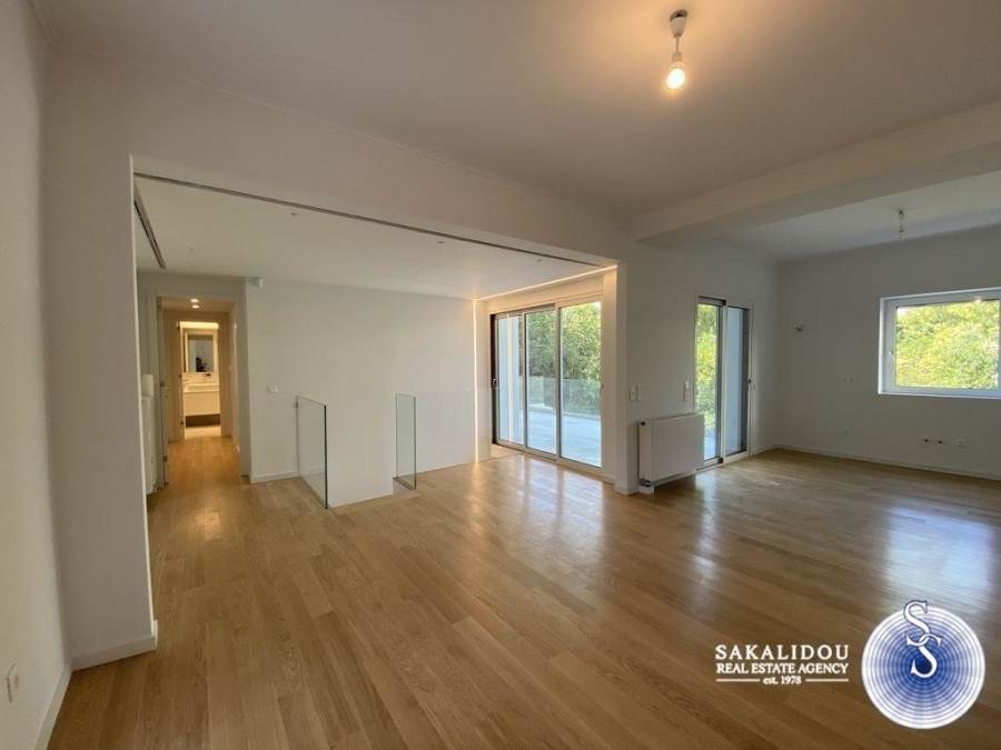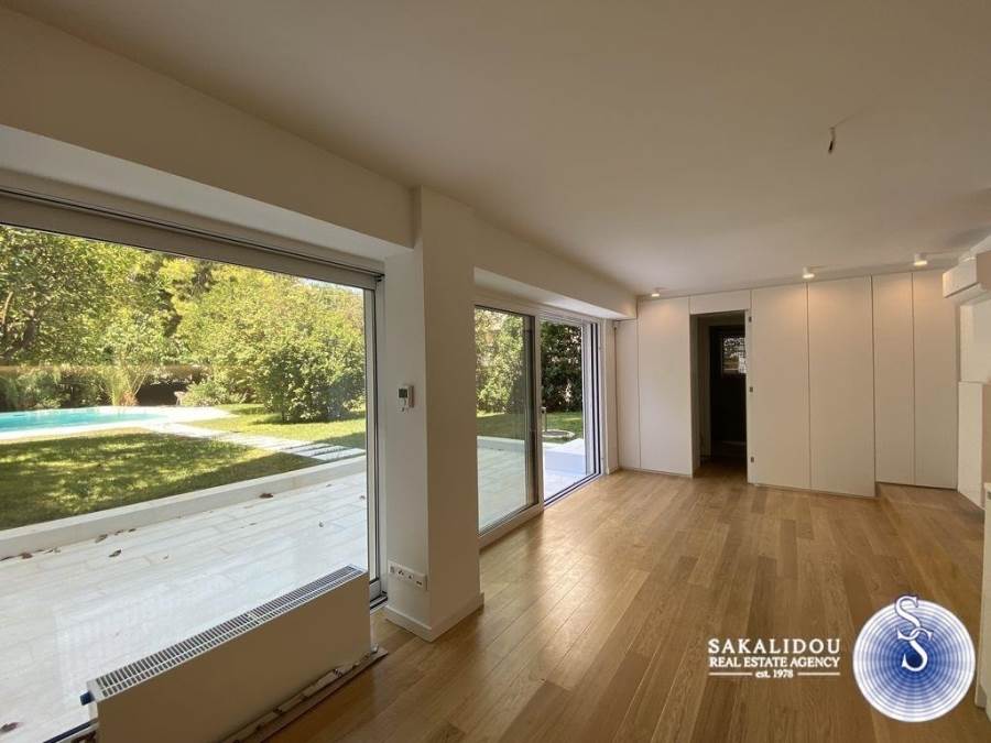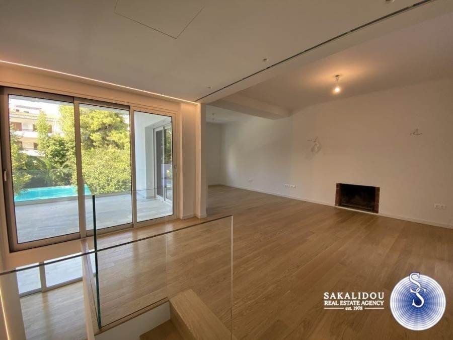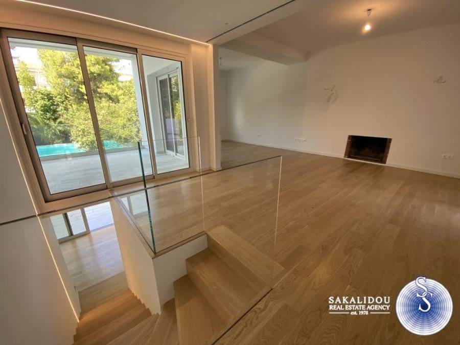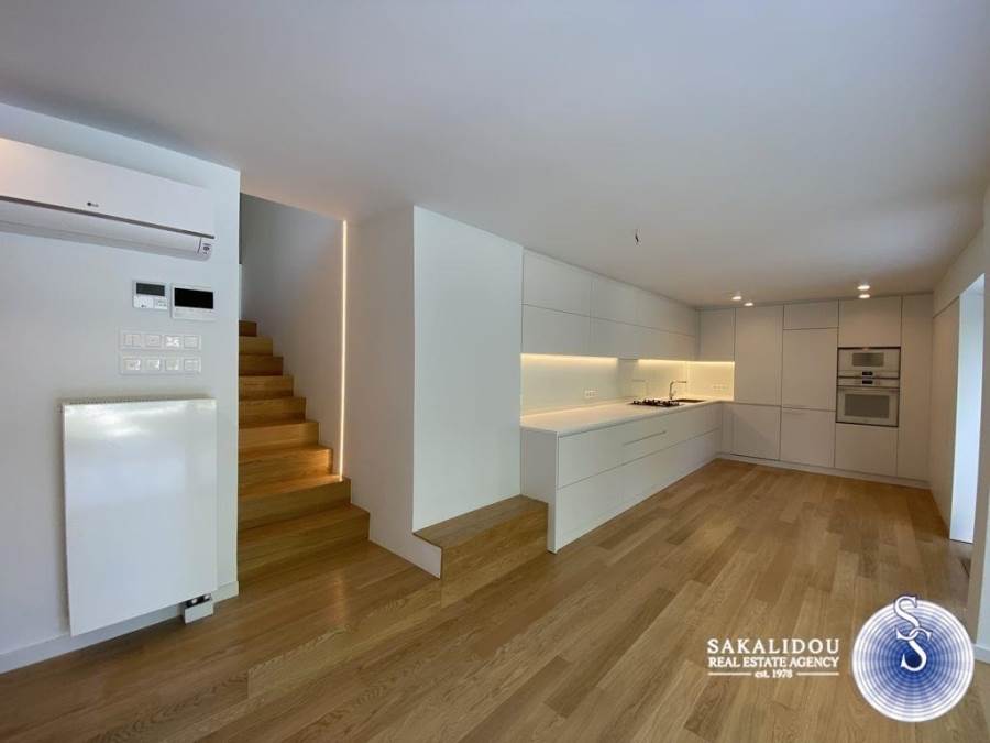 Voula, Kato Voula, amazing, luxury maisonette 150 sq.m. of minimal design, with beautiful garden and exclusive use pool and its own independent entrance, completely renovated in 2020. The maisonette consists of 2 levels (ground floor-1st) and has 3 bedrooms (1 master), 2 bathrooms, large and bright reception area with fireplace, kitchen with built-in appliances, marble & oak floors, double glazing and electric shutters, central air conditioning, autonomous gas heating, storage areas.